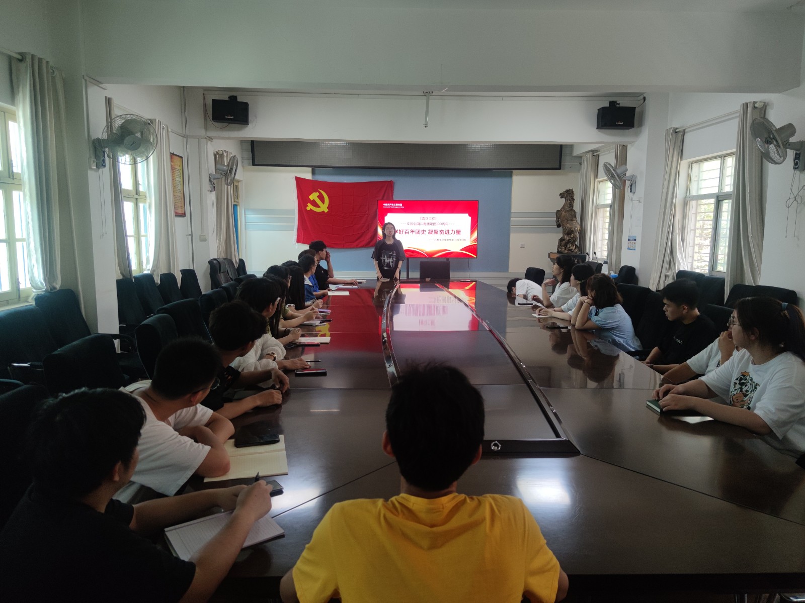 二楼会议室集中学习习近平总书记的重要讲话精神,她做了题为“学好百年团史、凝聚奋进力量”的主题培训,在会上她讲到:“100年来共青团始终牢记坚定不移跟党走、为党和人民事业不懈奋斗的初心和使命,坚持‘党有号召,团有行动’的光荣传统,团结带领一代又一代中国青年冲锋在前、担当作为,谱写了一曲曲与人民同命运、与祖国共奋进的青春之歌。”她积极号召学生干部要有责任、有担当,团结带领广大团员青年勇做新时代的弄潮儿。