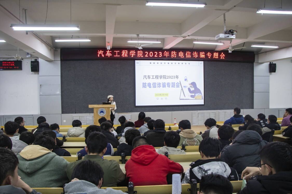 于6113报告厅召开2023年防电信诈骗专题大会。分党委副书记杜昕俊、学工办主任胡霄寒、辅导员李旭及车院20级全体同学参会。