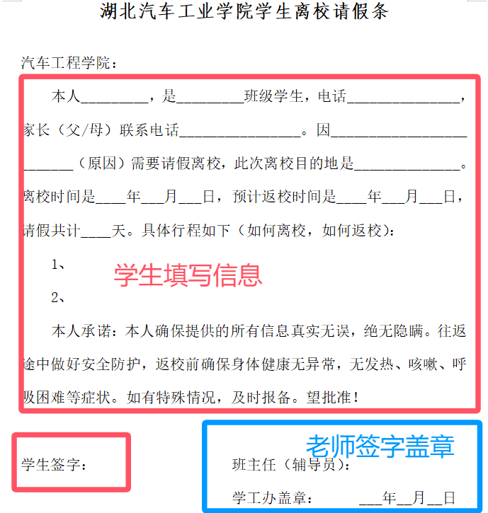 (1)不需要离校过夜时,需在学工办开具纸质版请假条如下图,学生如实填写相关信息,辅导员审核签字盖章有效;