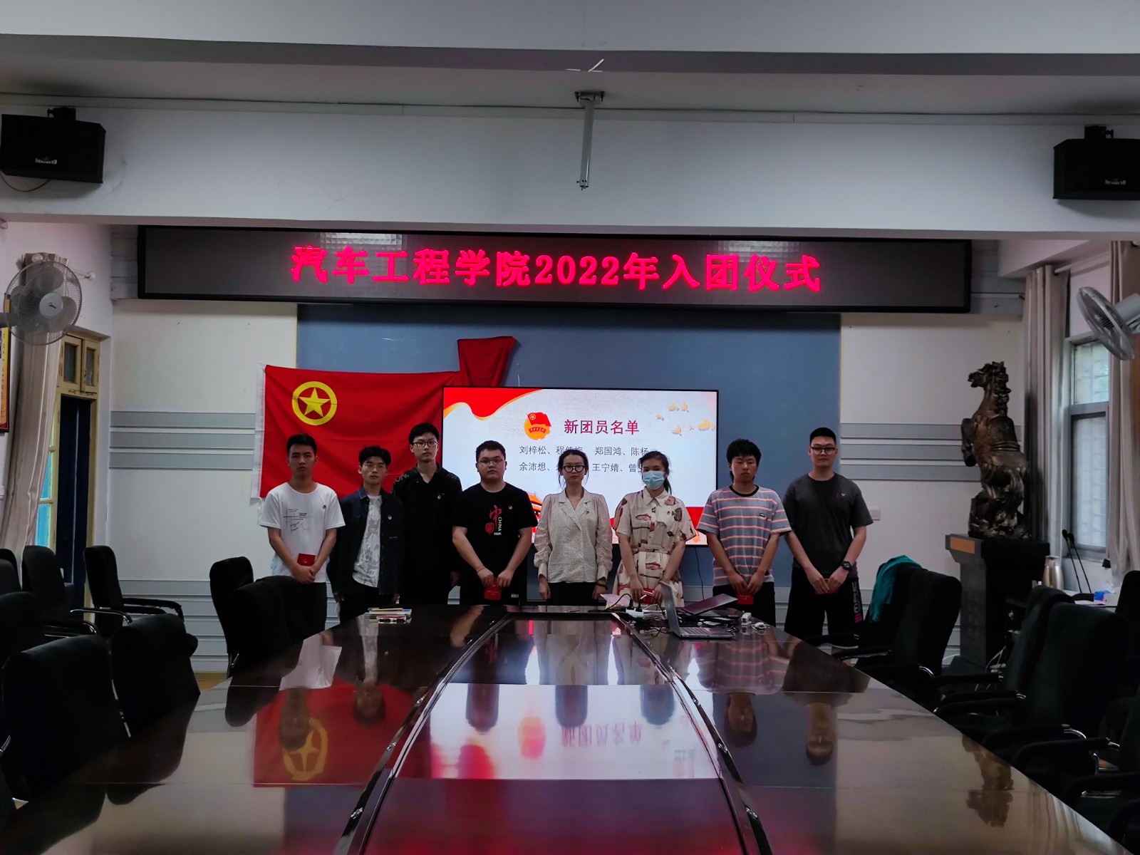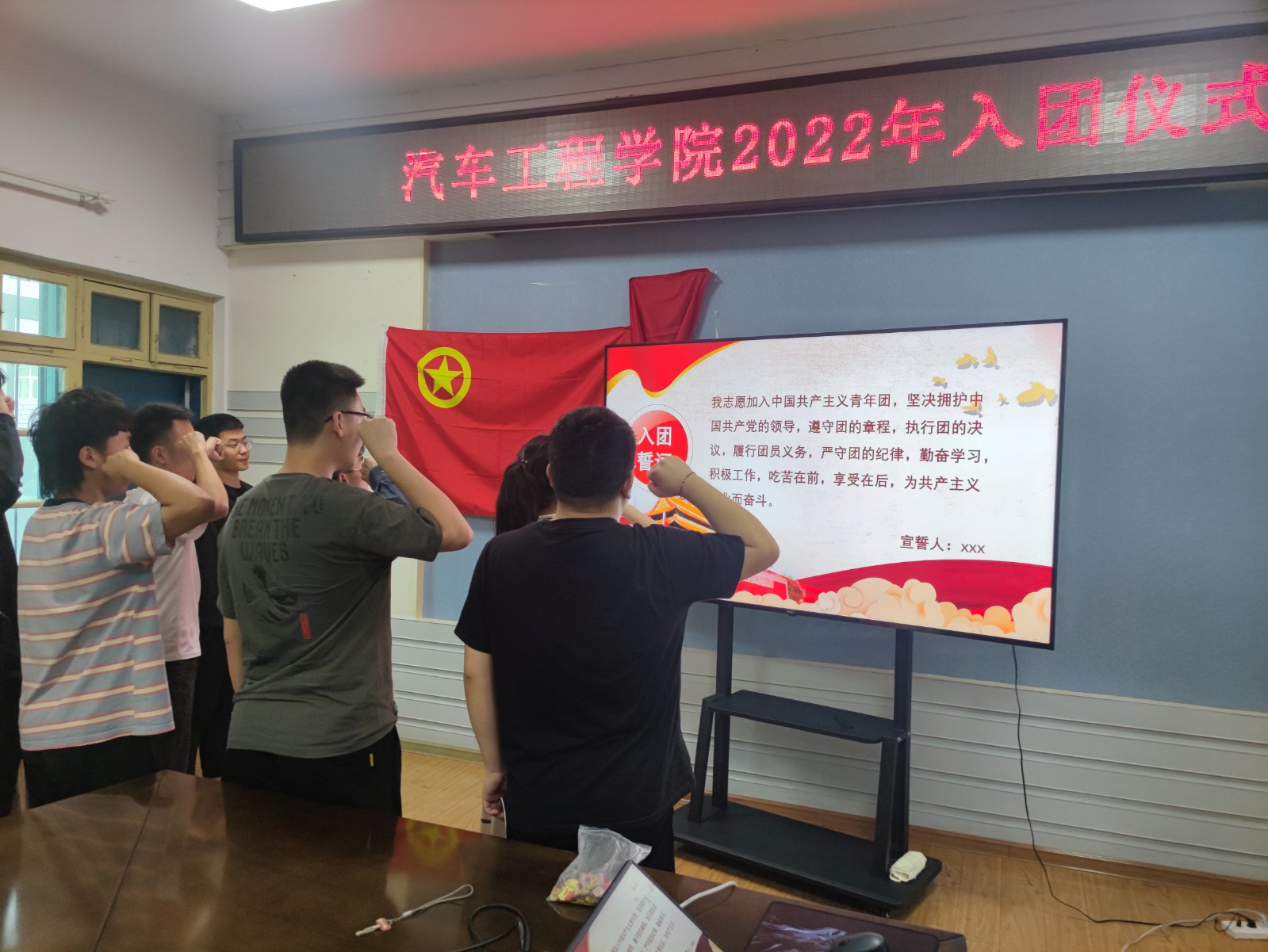 活动开始,全体人员唱国歌、团歌,张昕宇宣读了新团员名单,李键雯为各位新团员佩戴团徽、颁发团章。在刘晓哲的领誓下,预备团员在团旗下进行了庄严宣誓,成为了真正意义上的共青团员。