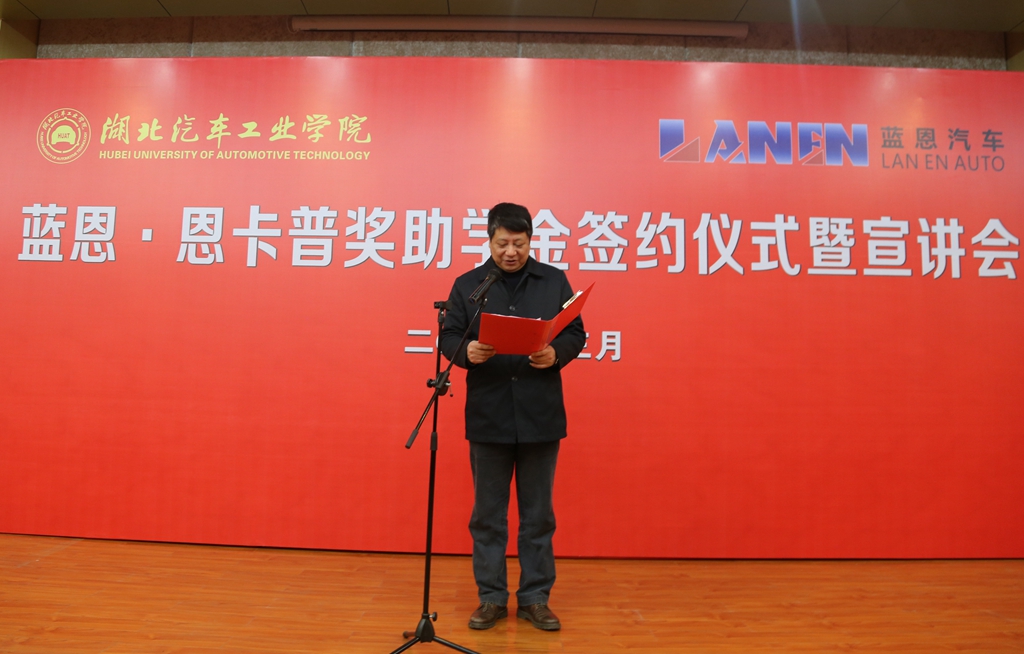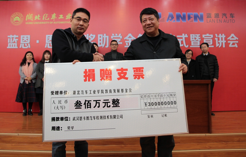 03届校友、武汉蓝恩新能源汽车产业发展股份有限公司董事长蒋武代表公司与母校在逸夫图书馆报告厅签订了奖助学金捐赠协议,为母校捐赠300万元设立“蓝恩·恩卡普奖助学金”,这也是信誉好的博彩平台自建校以来校友企业最大单笔捐赠。