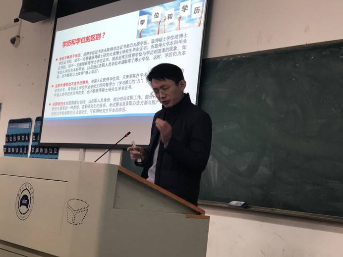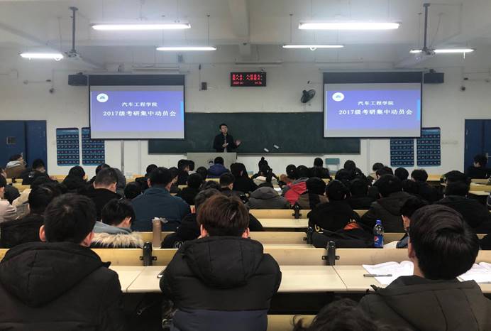 毕业生考研情况、问题和建议四个方面进行了深入浅出的动员讲话。他强调了学历学位在终身职业发展中的重要作用,分析了当前国家高等教育发展形势和高校的分类,引导学生充分了解高校层次、进行合理定位,并以详细的统计数据和车院学子近五年考研录取情况加以分析,劝导大家理性思考、慎重选择。他还结合往届学子一个个鲜活的考研案例,分析了作为汽院学生在就业、考研、留学等方面的基础和优势,同时结合《汽车产业中长期人才发展研究报告》有关内容,鼓励同学们认清自我定位、树立充足自信,以更高标准对待自己的学业和将来的职业,积极选择考研深造。在考研问题和建议剖析部分,他要求同学们一定要思考和明确考研动机、学习能力、家庭条件、个人定力等问题,鼓励同学们利用即将到来的寒假,主动与父母进行沟通,尽早制定考研规划,“只争朝夕、不负韶华”,以奋斗之青春赴理想之未来。