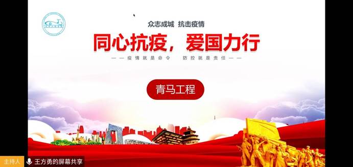 2020年青马工程的总体计划和疫情期间开展此次活动的目的及其必要性。随后,学生党支部书记李雅琨作为此次活动的主讲人,以“同心抗疫、爱国力行”为主题进行了深刻的剖析和讲解。疫情就是命令,防控就是责任,她结合疫情期间国家快速组织专家、医疗物资、生活物资等各种资源同心抗疫的一个个实例,让同学们认识到中国特色社会主义制度集中力量办大事的优越性;通过疫情发展中,党中央的正确领导和基层一封封一线“请战书”清晰展示了中国共产党的伟大号召力;透过“最美逆行者”、志愿服务人员等奋战在一线抗疫防疫的人们和社会各界爱心人士的捐助、支援,讲述了人民力量的伟大,引申出爱国主义其实就在我们每个人的身边,我们青年人都要用自己的实际行动为国家为社会贡献一份力。她呼吁所有的车院学子们不断强化四个意识、坚定四个自信、践行两个维护,不信谣、不传谣、不恐慌,坚守光明、理性思考、传递正能量,争做新时代的青年榜样。