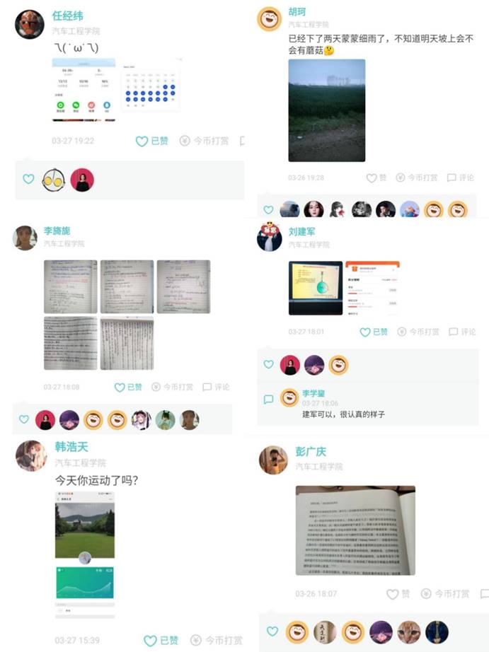 截止当前,车院学子已坚持学习打卡半个月,每日今日校园朋友圈都能看到精彩纷呈的车院人风姿,在打卡相对集中时间段往往出现了刷屏现象。秉承着全员学习,不落一人的目标,学生会全体学生干部带头引导各班开展“云学习”,分享每日学习、运动、休闲动态。除了日常专业课程的充实,还有“学习强国”、“青年大学习”、“主题团日”、“味蕾部落”等一系列丰富多彩的多维度的活动贯穿在疫情期间的大学生活里。在家松散,学习效率低?学霸们每周开展“青春力量”系列主题分享,引领大家互相学习、共同进步。在家没场地,锻炼不便?体育部健将们自制5分钟室内运动训练视频,一步步带你享受锻炼的快乐。在家懒惰,被父母嫌弃?美食制作分享征集给你成为厨艺达人的机会。分享单词、笔记、摄影、手工、居家趣事等也都成为了同学们秀圈的素材,正规博彩平台