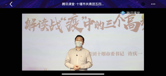团课由十堰市市委书记许庆一担当主讲人,十堰市各校学生齐聚腾讯课堂聆听受讲。团课开始前,许庆一邀请全体人员起立,歌唱共青团。随后分别详细解读了“青年担当”、“制度自信”、“人类命运共同体”三个战“疫”中的高频词。在青年担当的解读当中,书记强调,90后、00后不只是有一身标签,在疫情来临时,他们也可以是披荆斩棘的战士。通过“一句话”、“一杯咖啡”、“一首歌”所展开的故事,展示了当代青年勇担重任的责任意识和无私奉献的志愿情怀。在制度自信的解读当中,书记用“超高的行动效率”和“强大的组织能力”赞美了中国面对疫情时的镇定与团结。不仅向世界展示中国强大的号召执行力,同时也在一定程度上增强了同学们的民族自信心。新冠肺炎疫情的再次发生,人类是一个休戚与共的命运共同体。习近平总书记在与联合国秘书长古特雷斯通话时表示:“国际社会必须树立人类命运共同体的意识,守望相助,携手应对风险挑战,共建美好地球家园。”而市委书记解释“人类命运共同体”时清楚表示:人类命运共同体是指在追求本国利益时兼顾他国,合理关切,是在追求本国发展时促进各国共同发展,是你中有我,我中有你,是同呼吸、共命运。命运共同体在战“疫”过程中一个不可或缺的概念,在团课最后书记鼓励青年学生关注国家疫情动态发展,坚定民族自信心。