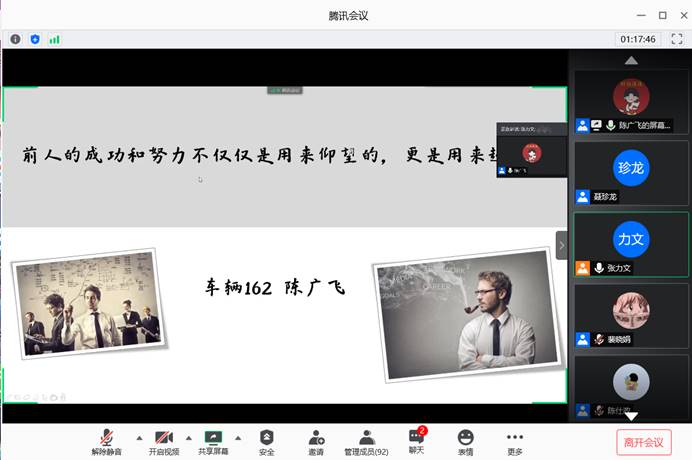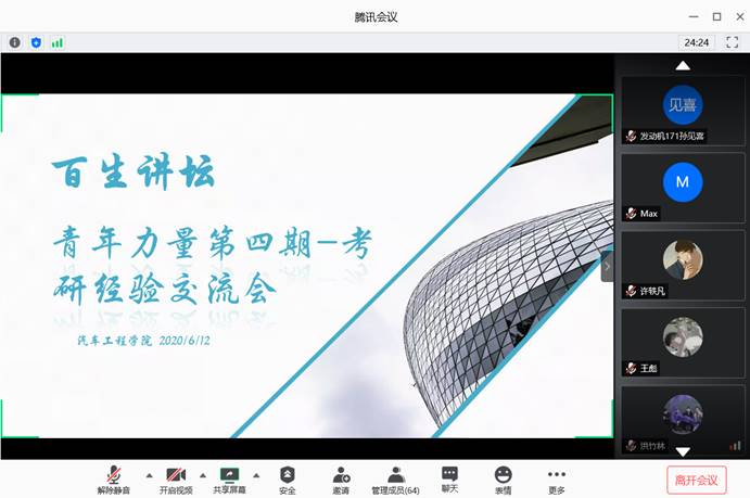 利用腾讯会议组织开展了【百生讲坛】青年力量·17级考研经验分享会,分享会邀请了16级考研录取的优秀毕业生白佳宁、陈广飞、李宇轩、王衡阳四人作为主讲人,分党委副书记李秀峰、分团委书记胡霄寒以及17级考研学子参与此次活动。