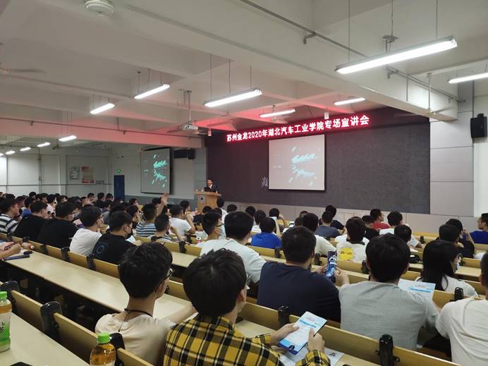 宣讲会。金龙豪华车技术部副部长杨光勉、招聘经理周芃、2020届校友郑茂秋等一行四人,车院学工办主任朱政、分团委书记胡霄寒以及17级全体学生参加此次宣讲会。