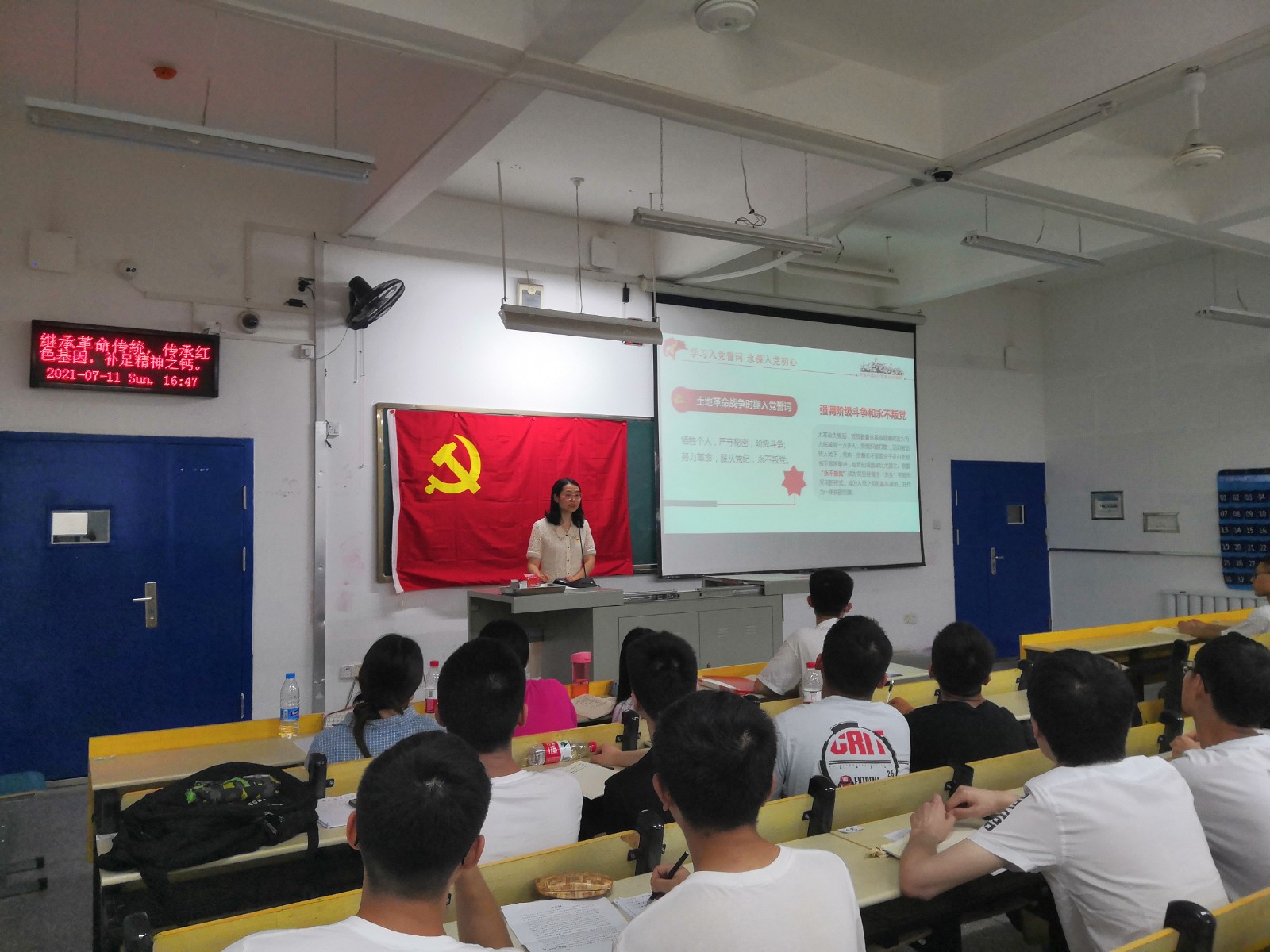 随后,杜昕俊以《从入党誓词领悟党员的初心和使命》为主题,从“学习入党誓词、永葆入党初心”,“践行入党誓词、牢记忠诚使命”,“铭记入党誓词、夯实忠诚信仰”,“奋进十四五、启航新征程”四个部分讲述了入党誓词的变化历程,强调忠诚与信仰的重要性,授课中她要求全体党员在“十四五”开局之年,牢记初心使命,时刻保持危机感,把“立大志、明大德、成大才、担大任”作为自己的标准,以奋进之姿迈向新征程。