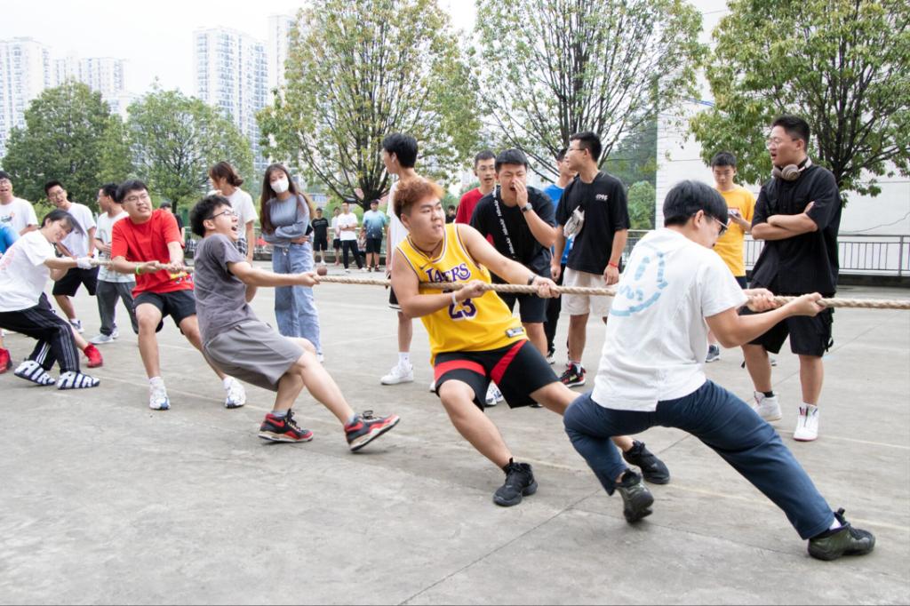 随着比赛哨声吹响,参赛队员们瞬间握紧长绳并且卯足劲,使出全力,身体倾斜的同时一步一步将绳子向身后拽扯。参赛队员奋力拼搏,未参赛的同学在自己班级队伍旁加油助威。比赛一场接一场,呐喊声、哨子声一阵接一阵。此起彼伏,好不热闹。比赛过程异常激烈,无论是在参赛人员还是助威观众都散发着青年大学生的蓬勃朝气!
