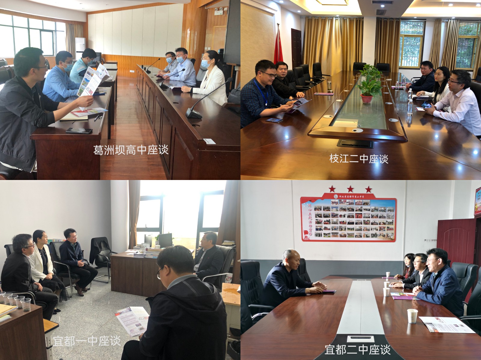 在符合当地疫情防控政策的前提下,宣传组一行拜访了宜昌市教育局领导,并与葛洲坝中学、三峡高中、宜昌东湖高中、宜都一中、宜都二中、枝江一中、枝江二中、当阳一中、当阳二中、长阳一中、长阳二中的校领导、高三年级主任及班主任等进行了座谈和交流,发放了招生宣传册,对长阳二中进行了优质生源基地授牌。