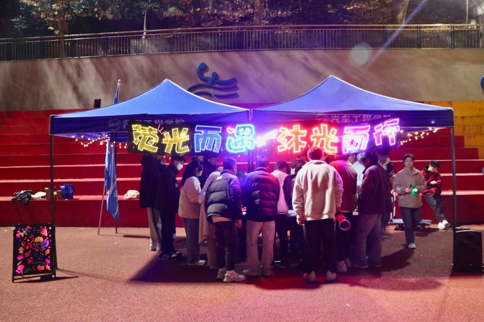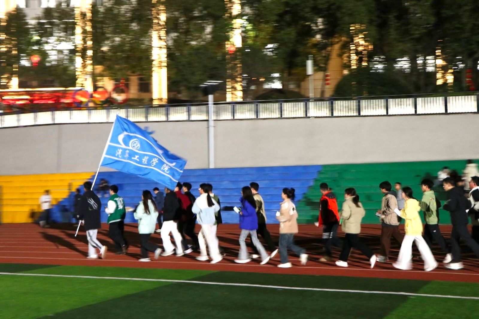在田径场将持续开展为期12天“荧光而遇·沐光而行”为主题的夜跑活动,学生党支部、学生会全体及23级学生参加了此次活动。
