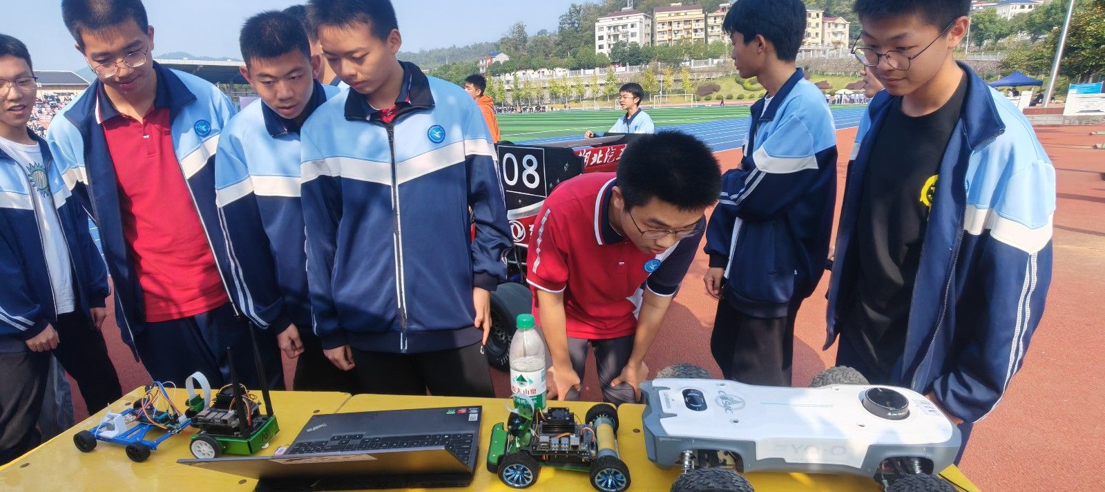 学生制作的往复小车、JetBot Al Kit人工智能机器车、JetRacer人工智能小车,以及由学生改装的曾获得中国机器人及人工智能大赛全国总决赛一等奖航天·轻舟机器人,几辆小车一字摆开,吸引众多学生驻足问询。
