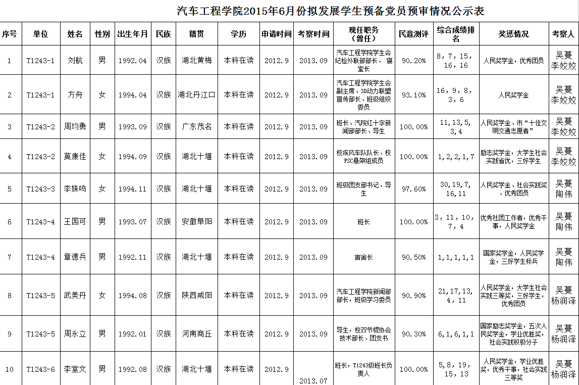 2015年6月份拟发展学生预备党员预审情况公示