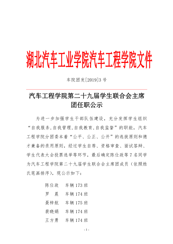 车院团发[2019]3号正规博彩平台 第二十九届学生联合会主席团任职公示.pdf