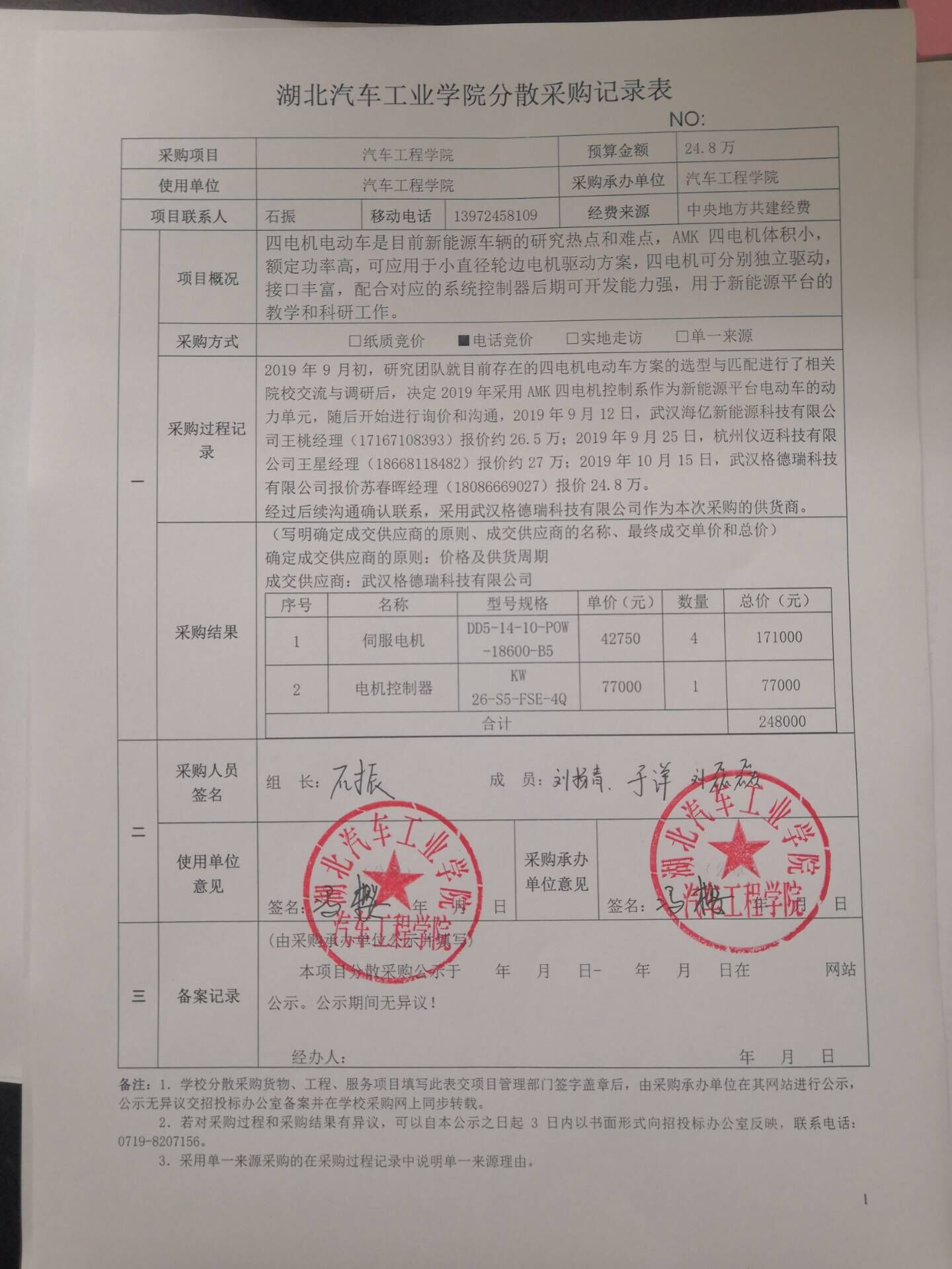 分散采购记录表(电动车四电机).doc