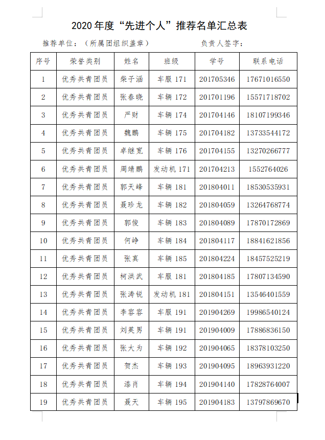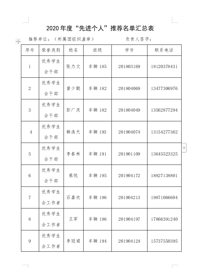 2020年度“先进个人”推荐名单汇总表-正规博彩平台 学生会.docx
