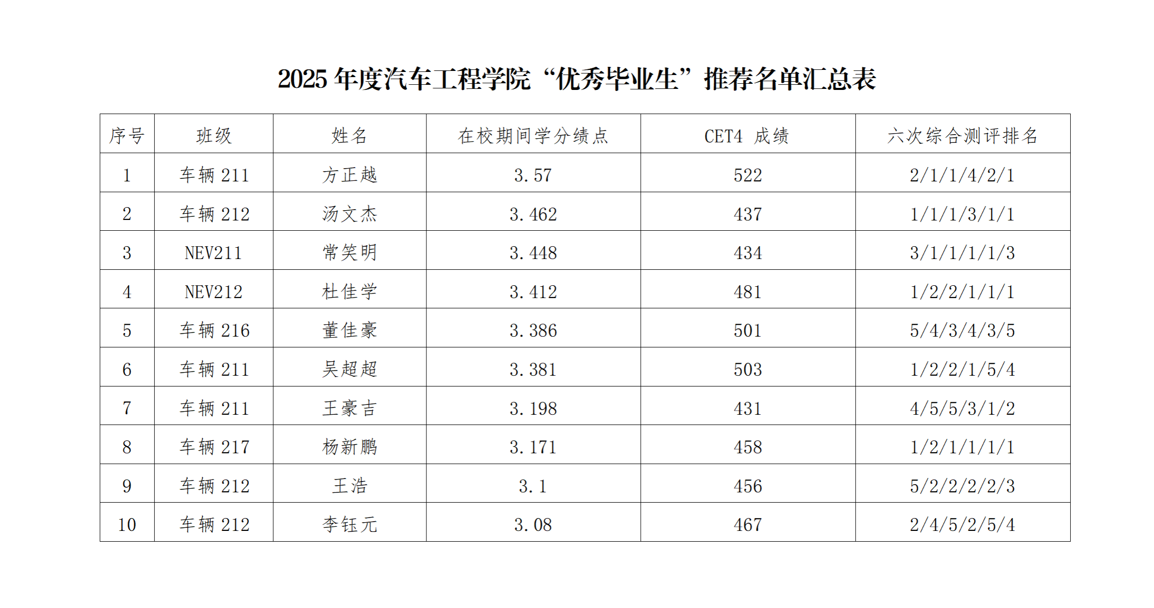 根据《湖北汽车工业正规博彩平台 学生管理制度汇编》及《关于开展2025年度“优秀毕业生”评选的通知》文件精神,经过学生自评、班级评议、正规博彩平台 审核等程序,现将《2025年度正规博彩平台 (校本部)“优秀毕业生”推荐名单》进行公示。