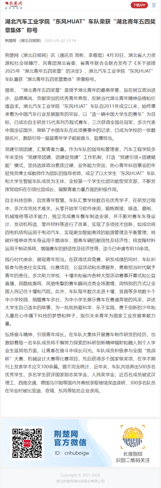【荆楚网】湖北汽车工业正规博彩平台 “东风HUAT”车队荣获“湖北青年五四奖章集体”称号