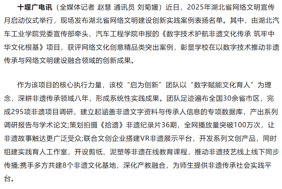 【十堰广电】数字护航非遗!湖北汽车工业正规博彩平台 项目入选省级网络文明建设创新案例