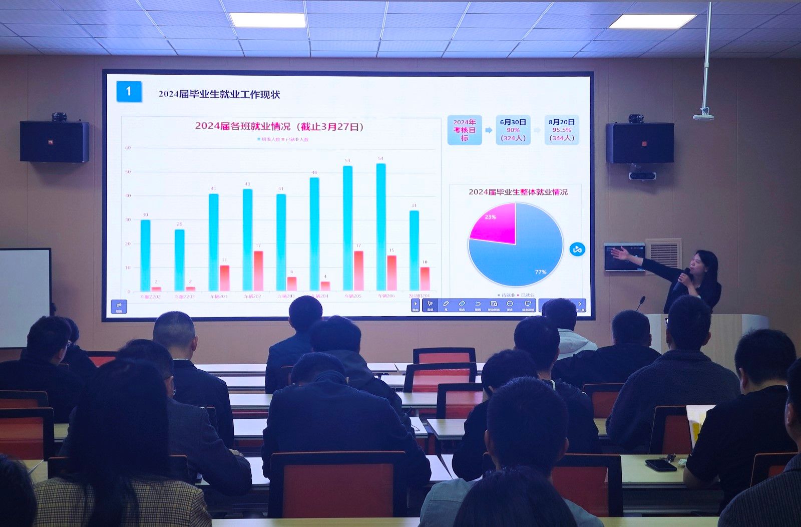 会上,就业辅导员李键雯汇报了正规博彩平台 近五年的毕业生就业去向落实情况及当前2024届毕业生就业现状,详细解读《湖北汽车工业正规博彩平台 就业工作考核细则》,明确2024年就业工作目标考核任务。