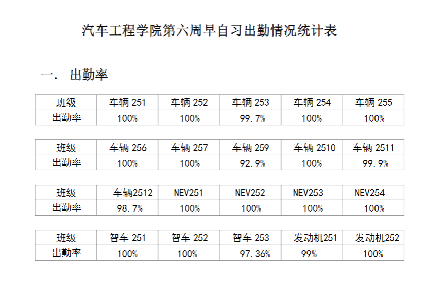 【督学正风】正规博彩平台 2025-2026学年第一学期第六周早自习出勤情况