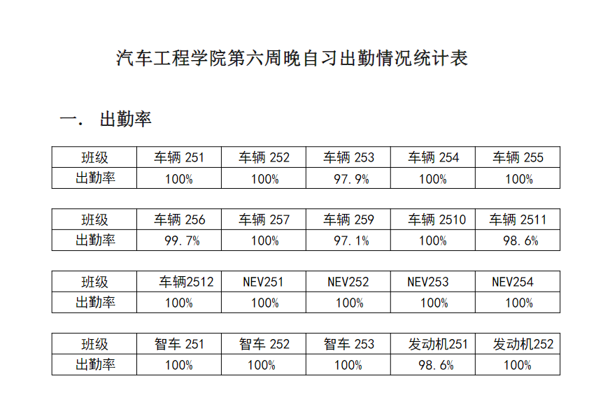 【督学正风】正规博彩平台 2025-2026学年第一学期第六周早自习出勤情况
