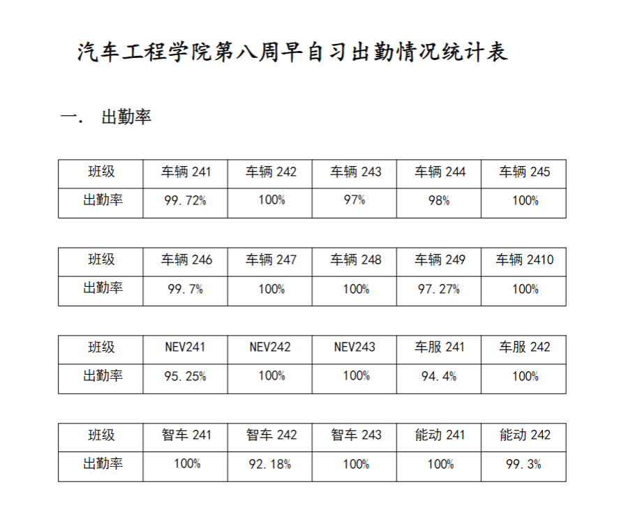 【督学正风】正规博彩平台 2024-2025学年第一学期第八周早自习出勤情况