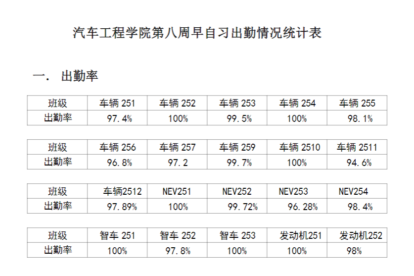 【督学正风】正规博彩平台 2025-2026学年第一学期第八周早自习出勤情况